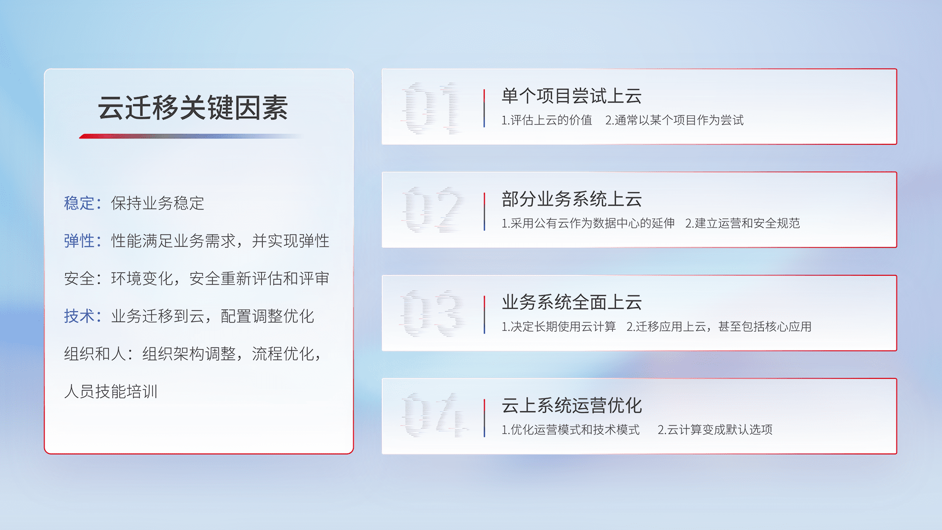 结合实际业务,,,从规划设计、、、、云平台选型、、、、云原生改造、、、、数据迁移、、、集成交付,,迁移全过程为客户识别最佳上云路径,,,做好风险识别管理,,设计网络架构、、、、身份权限、、安全审计合规、、、操作审计、、日志审计、、、监控告警策略、、、、多站点容灾设计等,,对云上基础设施进行整体规划,,,,提升IT治理水平,,,以满足弹性、、高可用、、高性能的需求。。